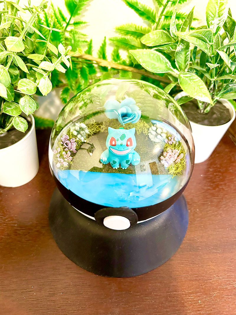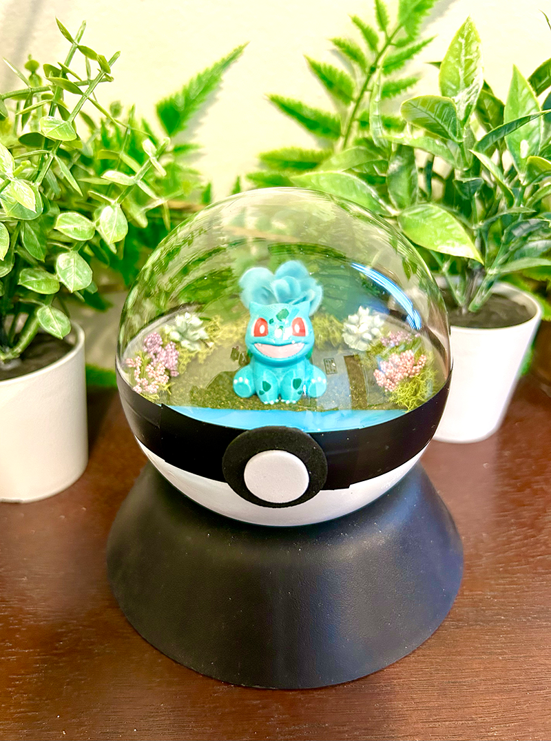 This is for a large 100mm Pokeball terrarium with a Bulbasaur in it. The Pokeball is made from a durable plastic and perfect for displays. It stays sealed shut and if zero maintenance! These terrariums have counter weights in them but they still do wobble, you can place them on a flat surface or use a display stand. It is totally up to you.