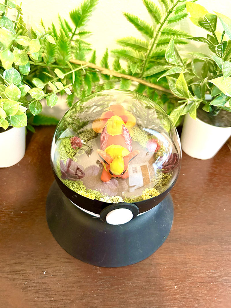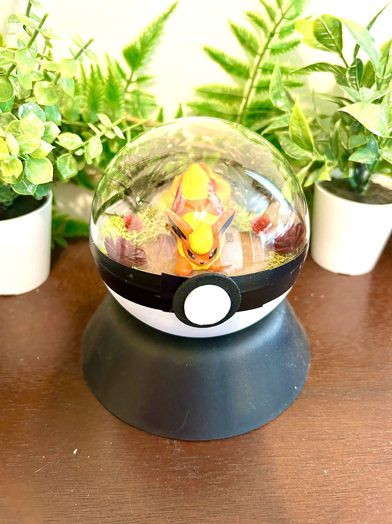 This is for a large 100mm Pokeball terrarium with a flareon in it. The Pokeball is made from a durable plastic and perfect for displays. It stays sealed shut and if zero maintenance! These terrariums have counter weights in them but they still do wobble, you can place them on a flat surface or use a display stand. It is totally up to you. You can snag a stand here.