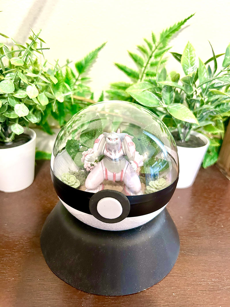 This is for a large 100mm Pokeball terrarium with a Palkia in it. The Pokeball is made from a durable plastic and perfect for displays. It stays sealed shut and if zero maintenance! These terrariums have counter weights in them but they still do wobble, you can place them on a flat surface or use a display stand. It is totally up to you.