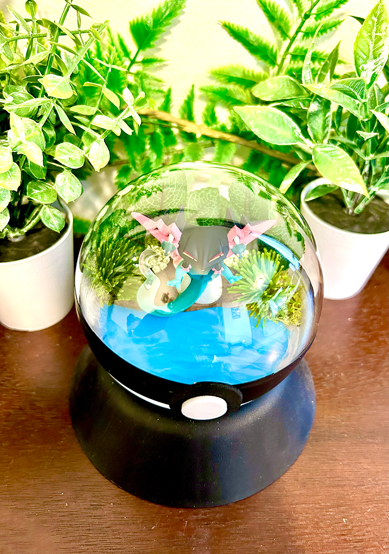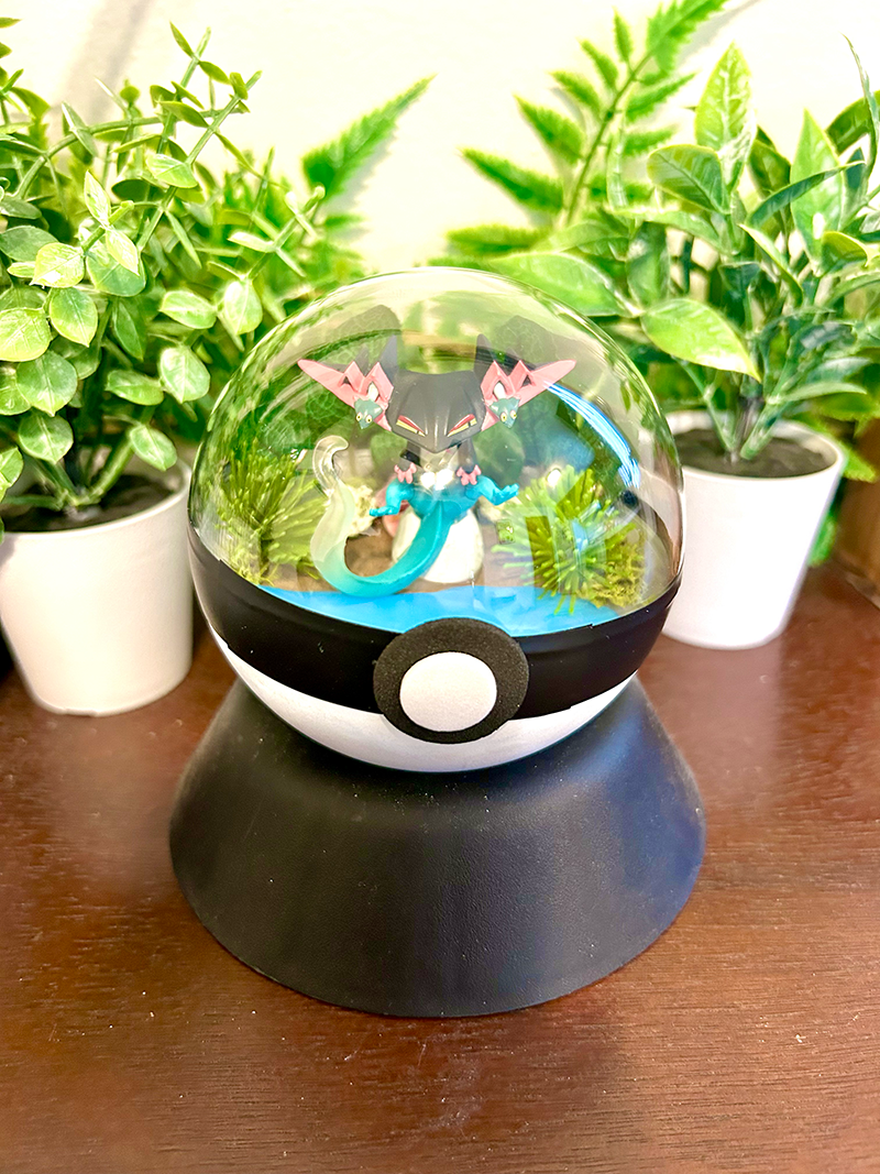This is for a large 100mm Pokeball terrarium with a Dragapult in it. The Pokeball is made from a durable plastic and perfect for displays. It stays sealed shut and if zero maintenance! These terrariums have counter weights in them but they still do wobble, you can place them on a flat surface or use a display stand. It is totally up to you.