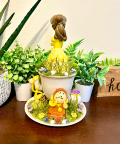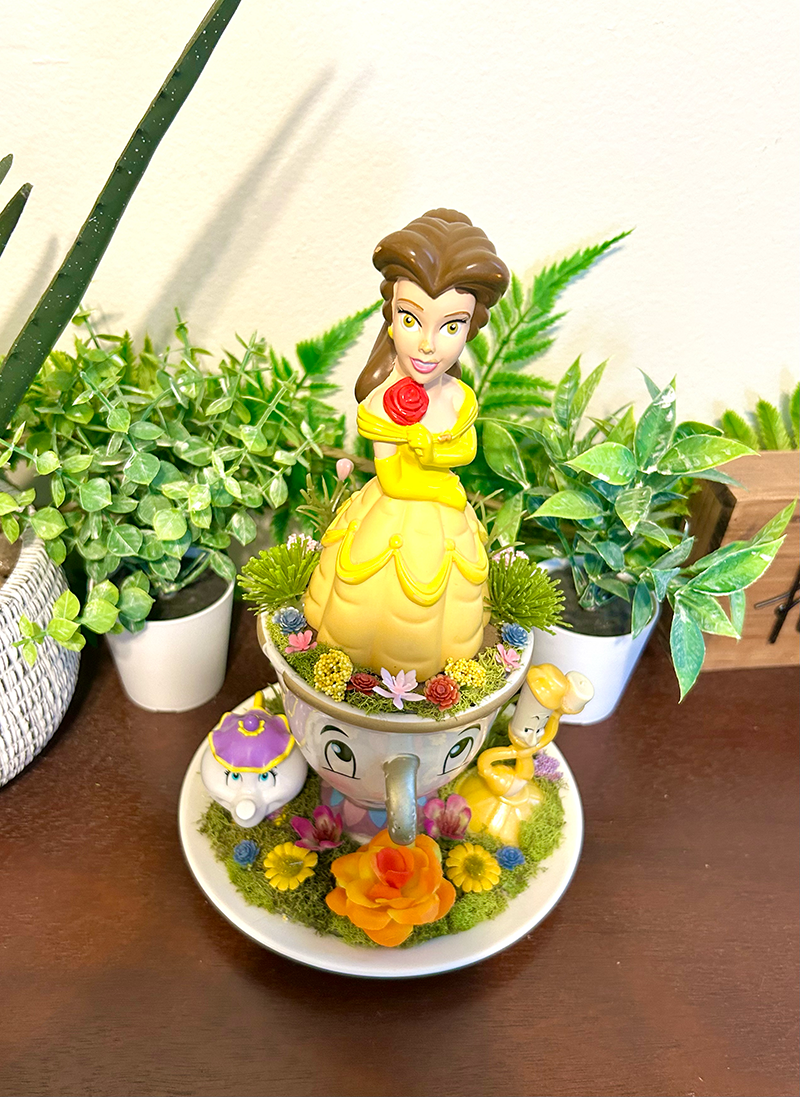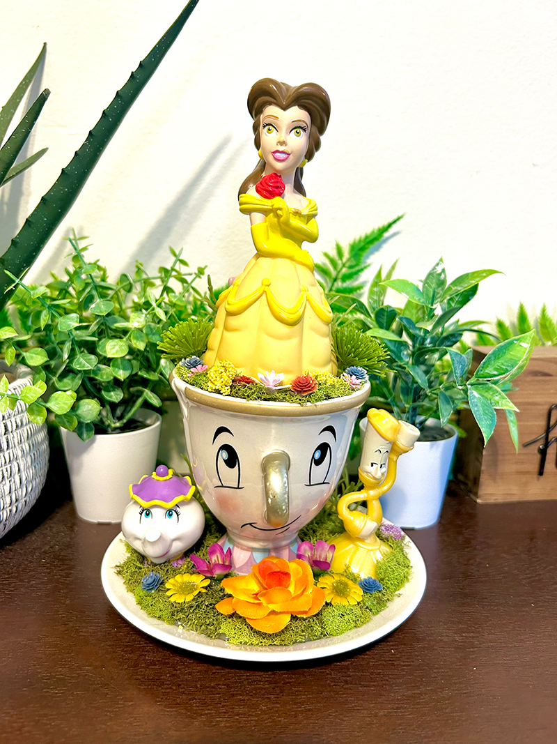 This tea cup terrarium features Belle from Beauty and the Beast. It is full with artificial flowers and succulents so it is zero maintenance. The tea cup and saucer are sealed together, so nothing will fall off, even if turned upside down.