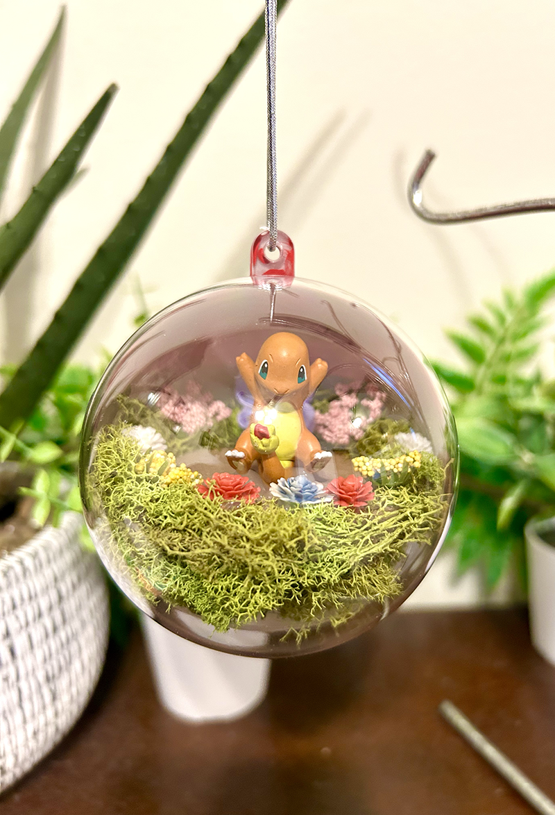 This is for a 60mm Pokeball terrarium ornament with a Charmander in it. The Pokeball is made from a durable plastic and perfect for displays either from a Christmas tree or just display it year round. It stays sealed shut and is zero maintenance!
