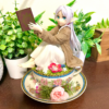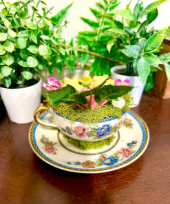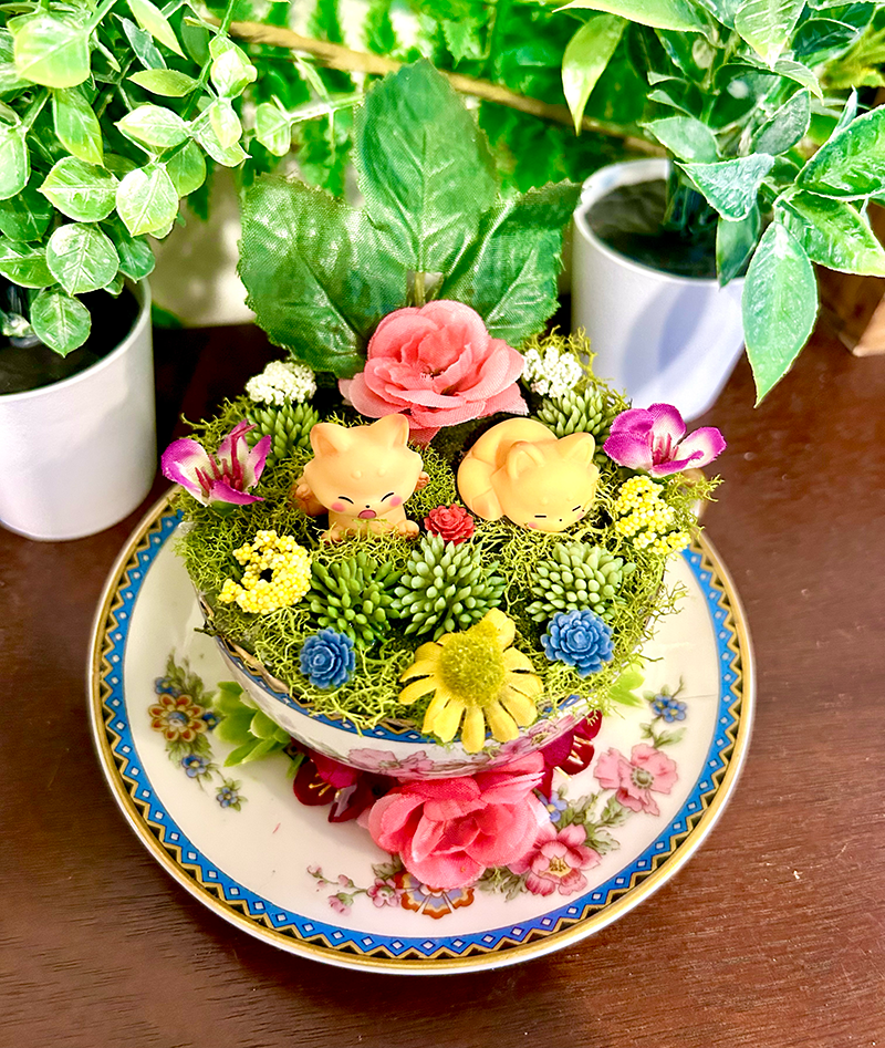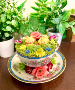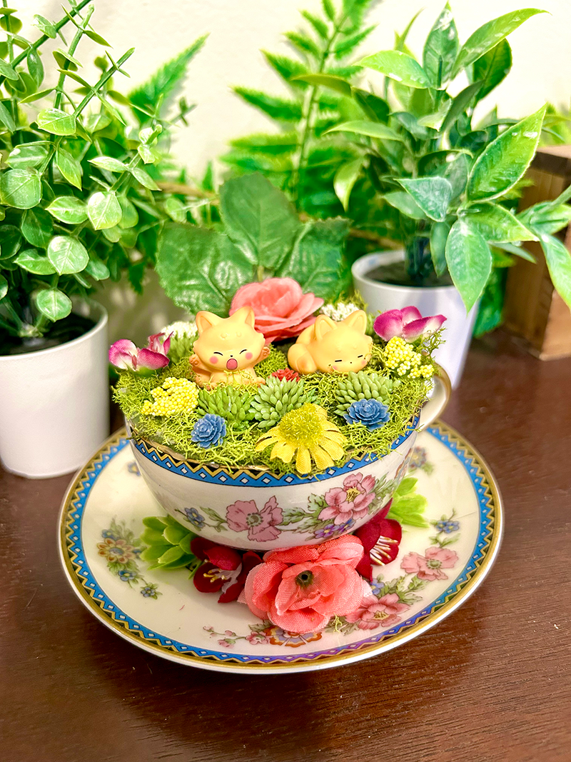 This tea cup terrarium features 2 sleepy Foxes. It is full with artificial flowers and succulents so it is zero maintenance. The tea cup and saucer are sealed together, so nothing will fall off, even if turned upside down.