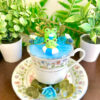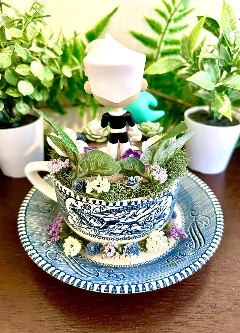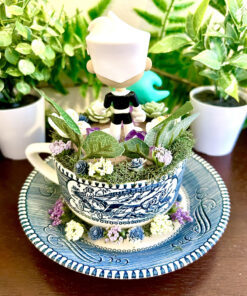 This tea cup terrarium features Danny & Ember from Danny Phantom. It is full with artificial flowers and succulents so it is zero maintenance. The tea cup and saucer are sealed together, so nothing will fall off, even if turned upside down.