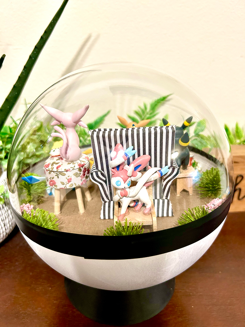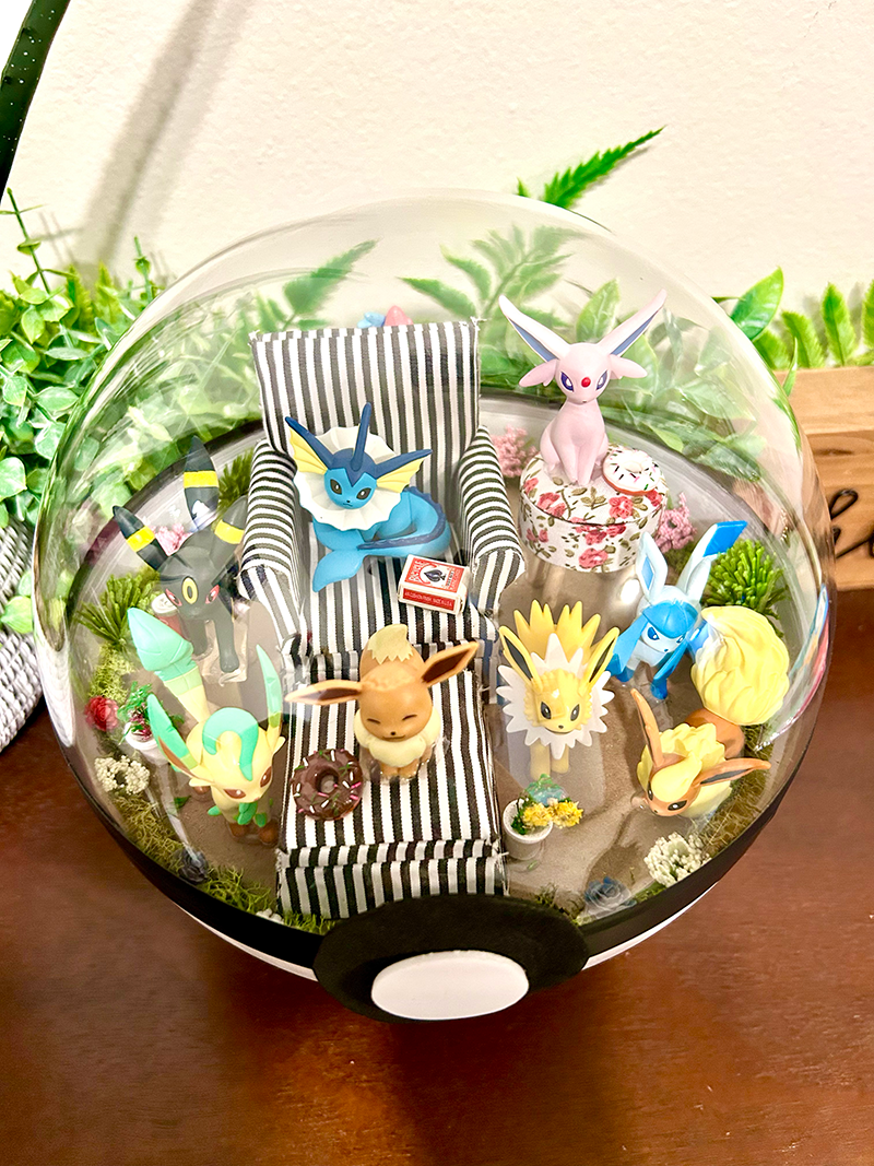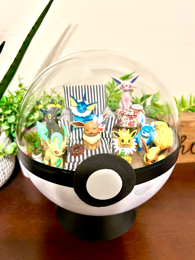 This is for a huge 200mm Pokeball terrarium with Eevee and all it’s evolutions in it. The Pokeball is made from a durable plastic and perfect for displays. It stays sealed shut and is zero maintenance! These terrariums have counter weights in them but they still do wobble, you can place them on a flat surface or use a display stand that comes with this huge terrarium.