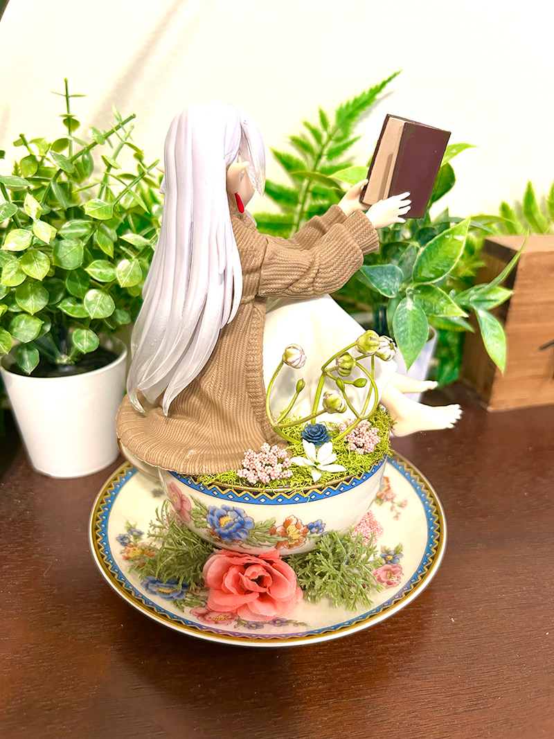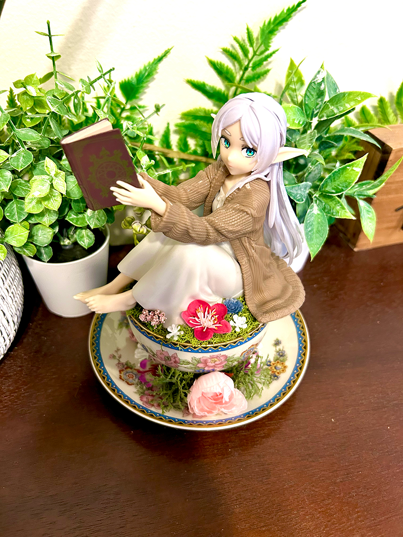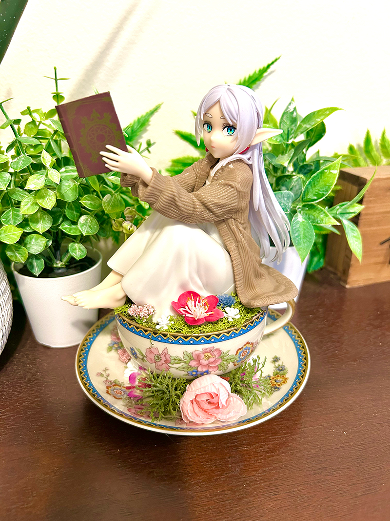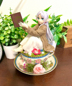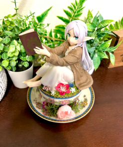 This tea cup terrarium features Frieren from Beyond Journey’s End. It is full with artificial flowers and succulents so it is zero maintenance. The tea cup and saucer are sealed together, so nothing will fall off, even if turned upside down.