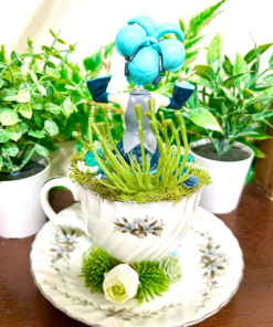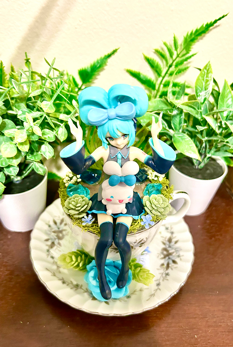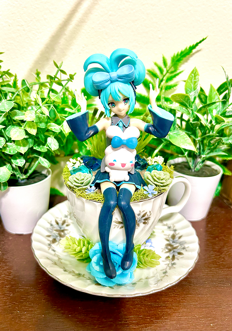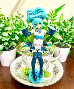 This tea cup terrarium features Hatsune Miku. It is full with artificial flowers and succulents so it is zero maintenance. The tea cup and saucer are sealed together, so nothing will fall off, even if turned upside down.