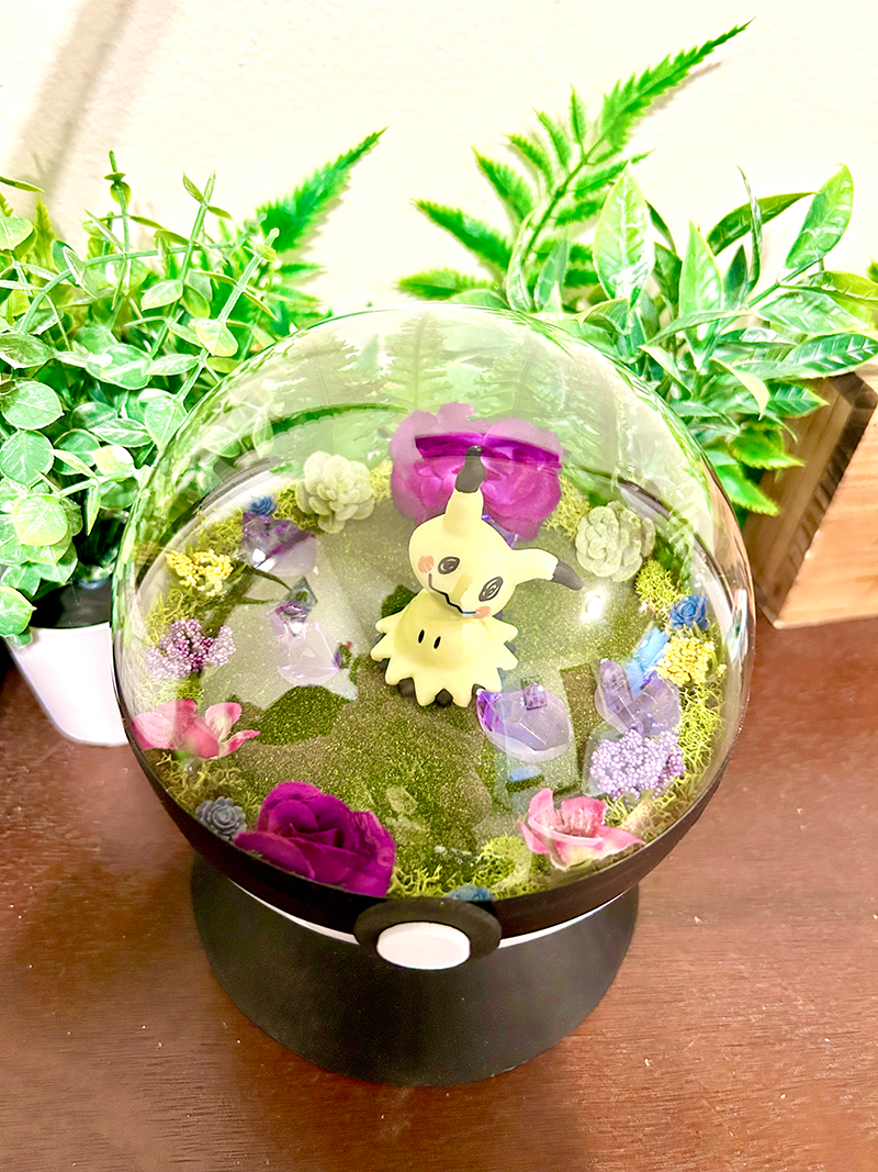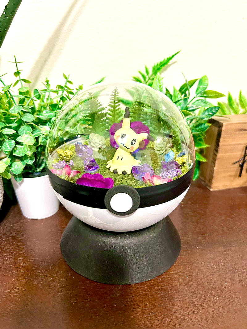 This is for a huge 140mm Pokeball terrarium with a Mimikyu in it. The Pokeball is made from a durable plastic and perfect for displays. It stays sealed shut and is zero maintenance! These terrariums have counter weights in them but they still do wobble, you can place them on a flat surface or use a display stand that comes with this huge terrarium.