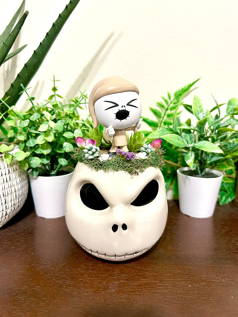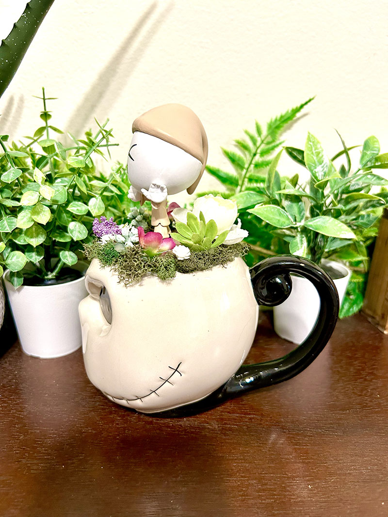 This tea cup terrarium features Jack Skellington from Nightmare Before Christmas. It is full with artificial flowers and succulents so it is zero maintenance. The figure, flowers and cup are sealed together, so nothing will fall off, even if turned upside down.