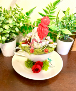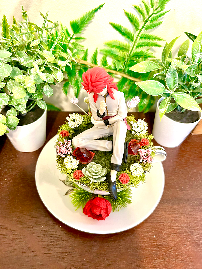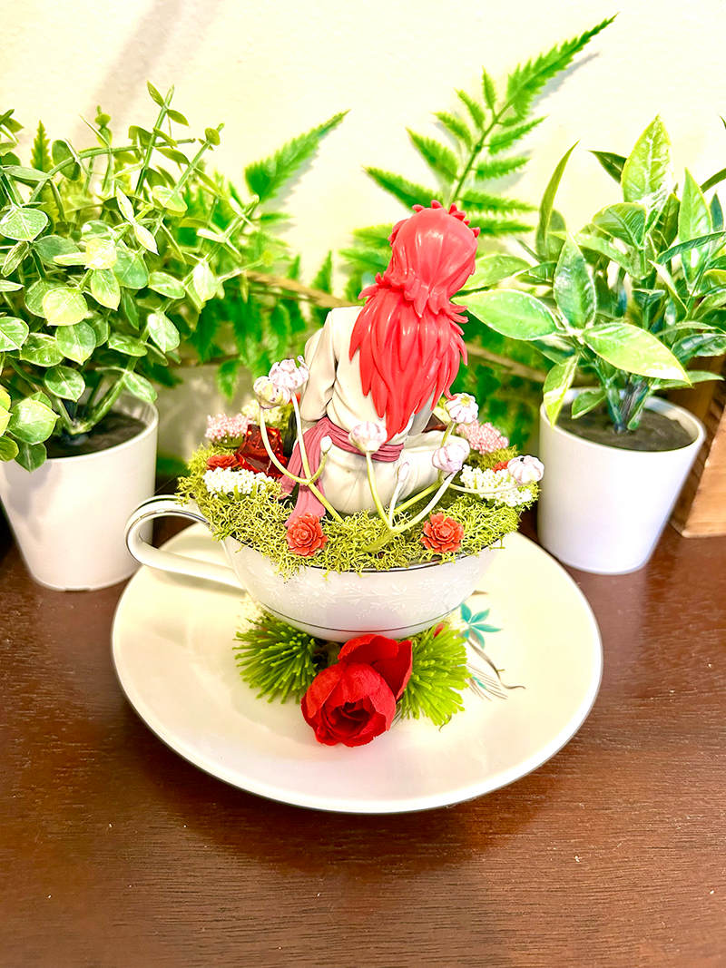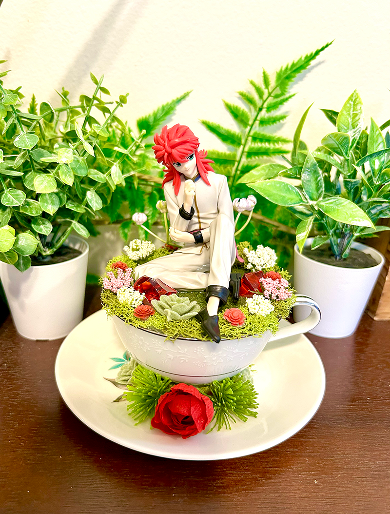 This tea cup terrarium features Kurama From Yu Yu Hakusho. It is full with artificial flowers and succulents so it is zero maintenance. The tea cup and saucer are sealed together, so nothing will fall off, even if turned upside down.