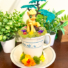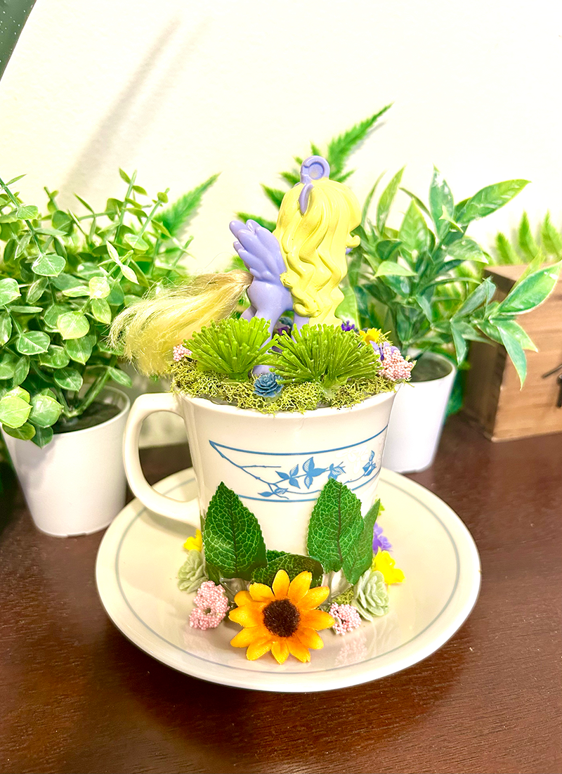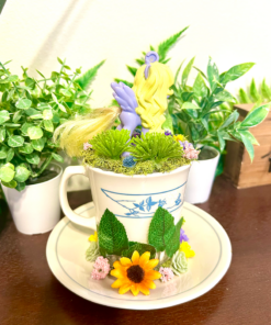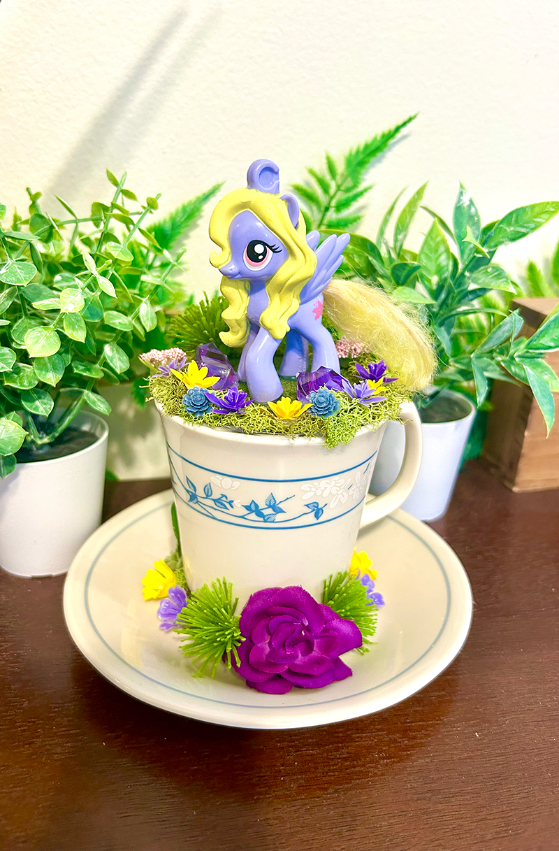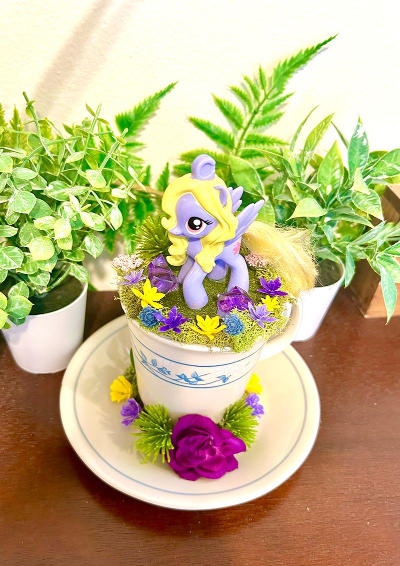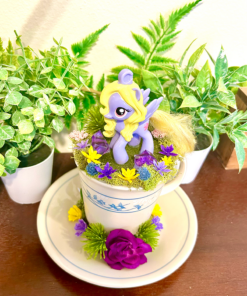 This tea cup terrarium features Lily Blossom from My Little Pony. It is full with artificial flowers and succulents so it is zero maintenance. The tea cup and saucer are sealed together, so nothing will fall off, even if turned upside down.