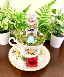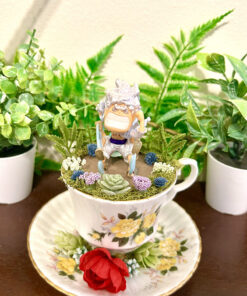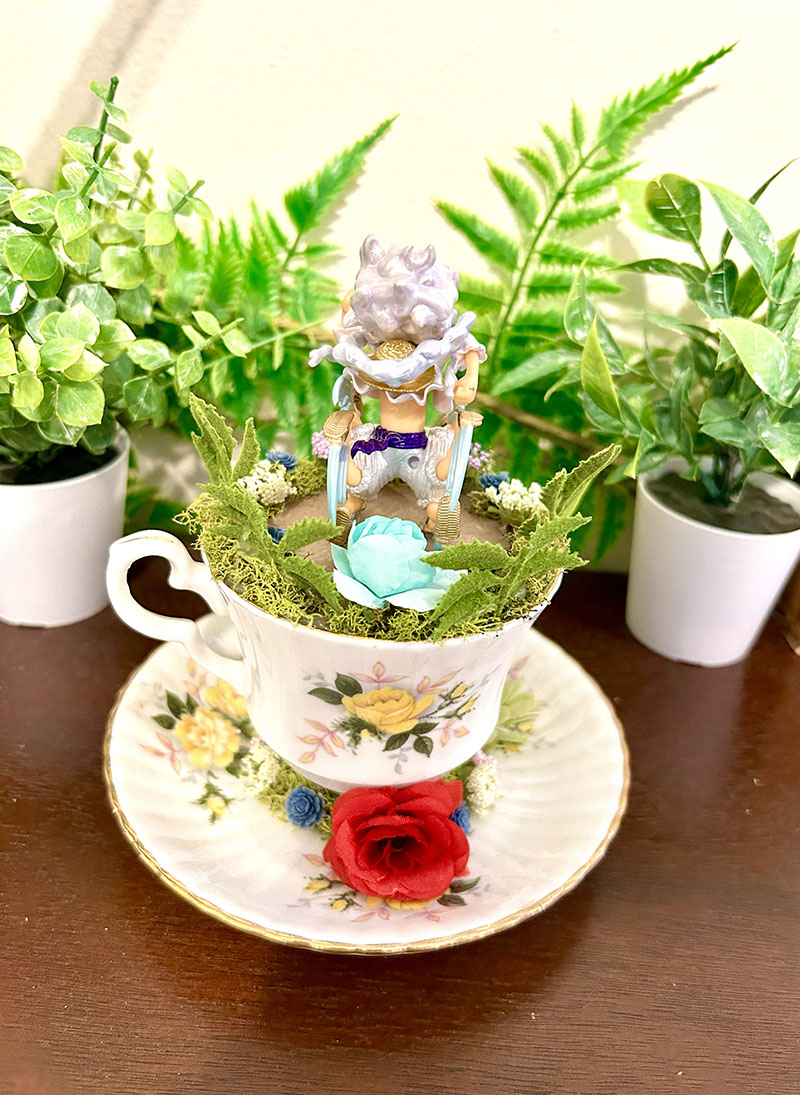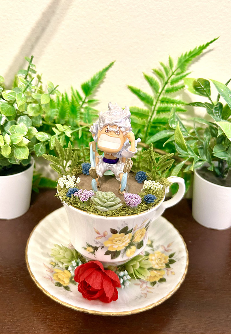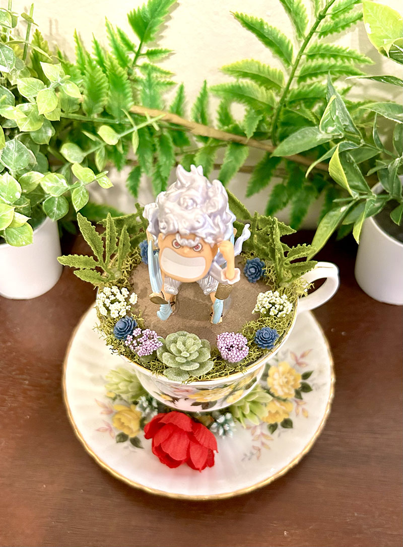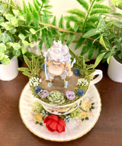 This tea cup terrarium features Gear 5 Luffy from One Piece. It is full with artificial flowers and succulents so it is zero maintenance. The tea cup and saucer are sealed together, so nothing will fall off, even if turned upside down.