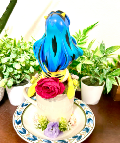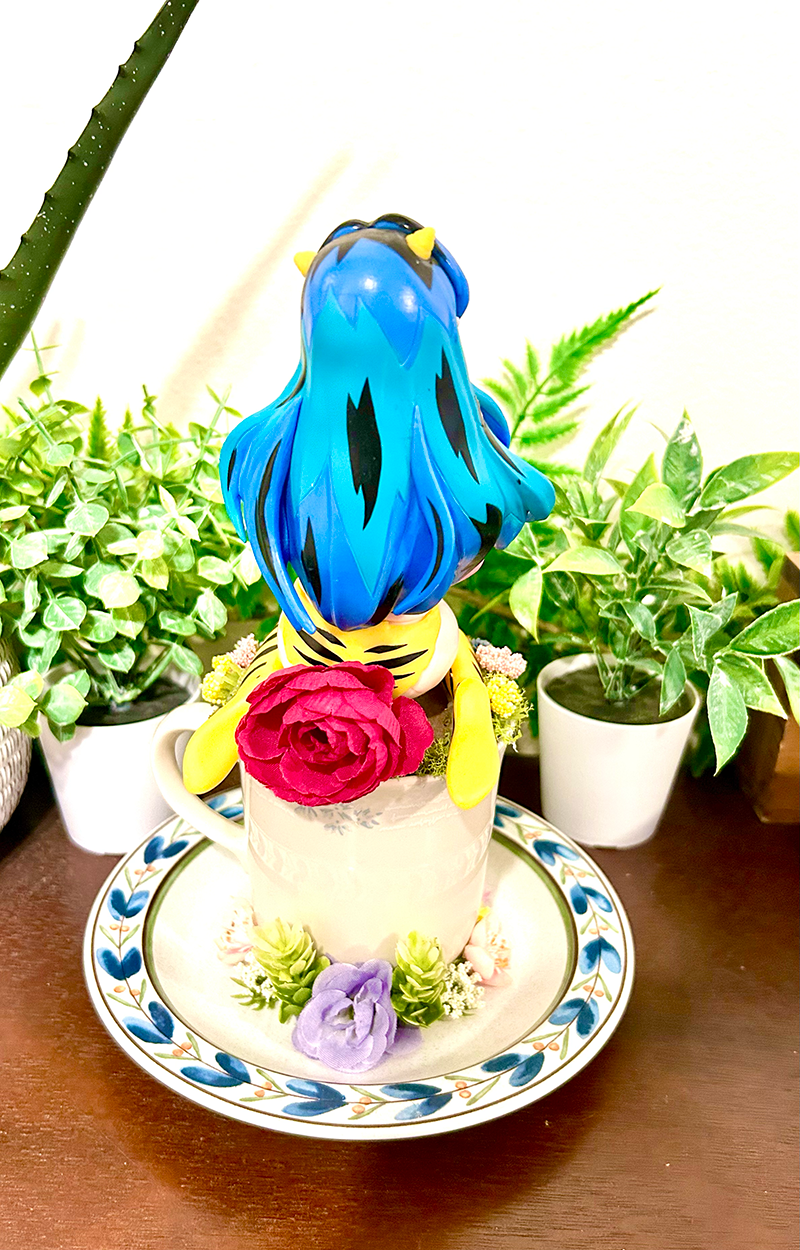 This tea cup terrarium features Lum from Urusei Yatsura. It is full with artificial flowers and succulents so it is zero maintenance. The tea cup and saucer are sealed together, so nothing will fall off, even if turned upside down.