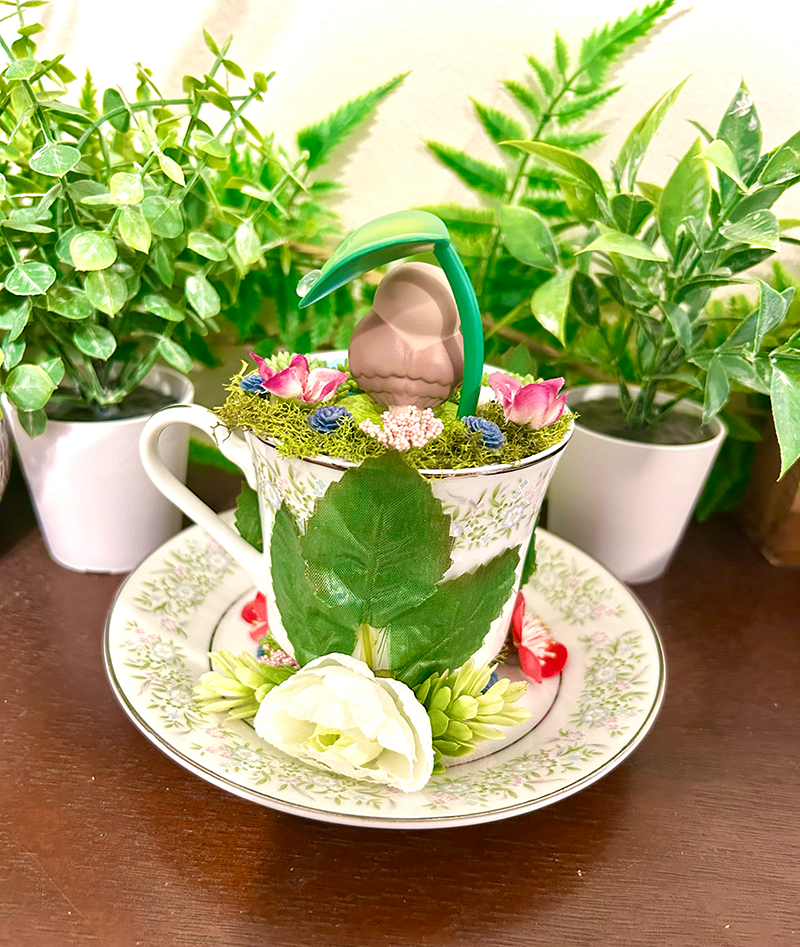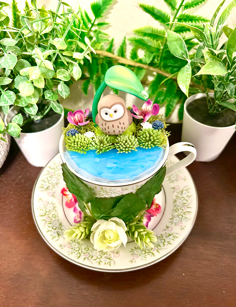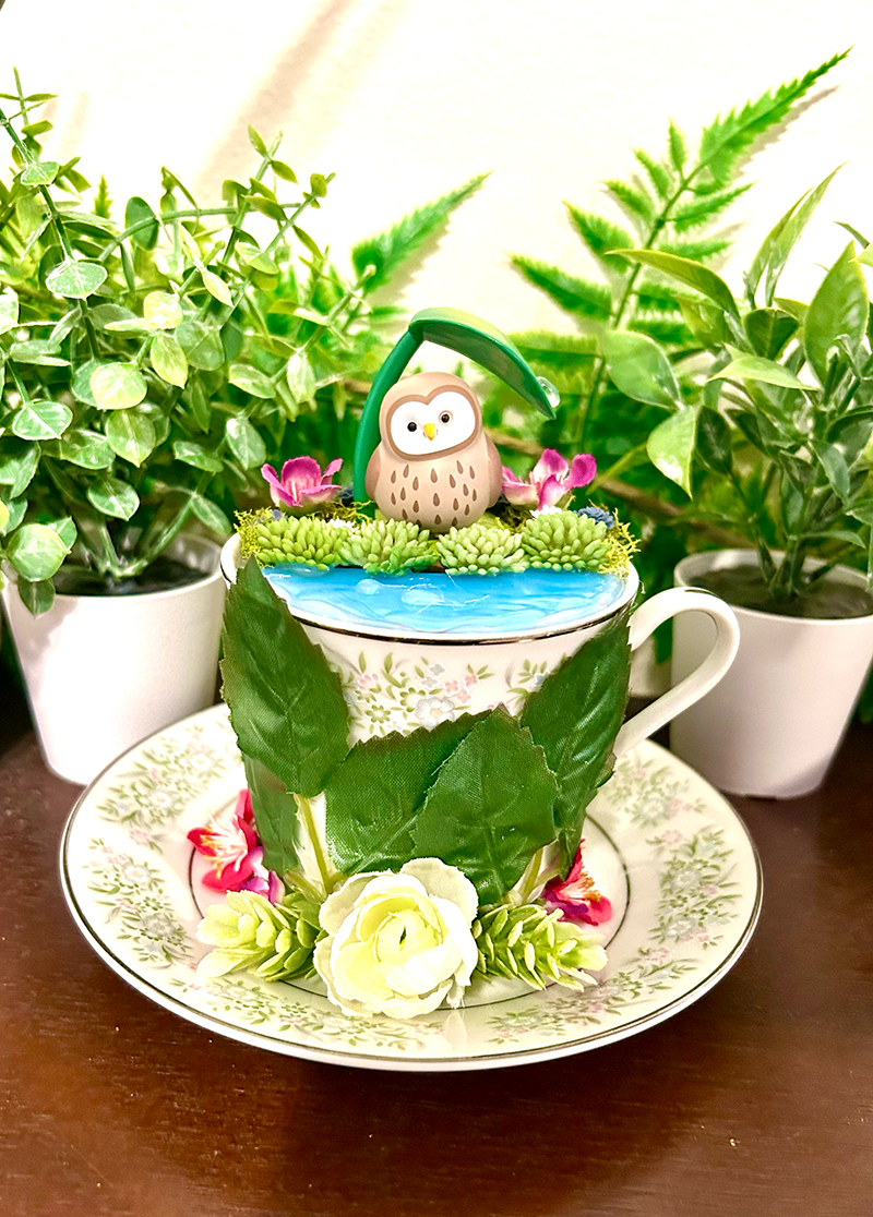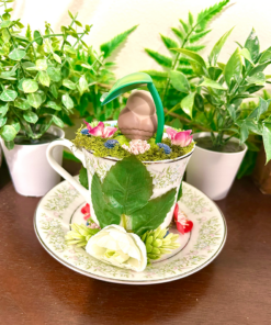 This tea cup terrarium features a cute owl. It is full with artificial flowers and succulents so it is zero maintenance. The tea cup and saucer are sealed together, so nothing will fall off, even if turned upside down.