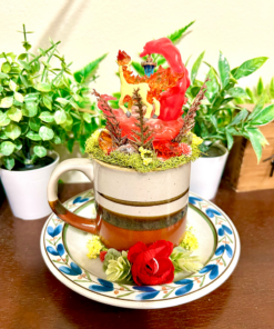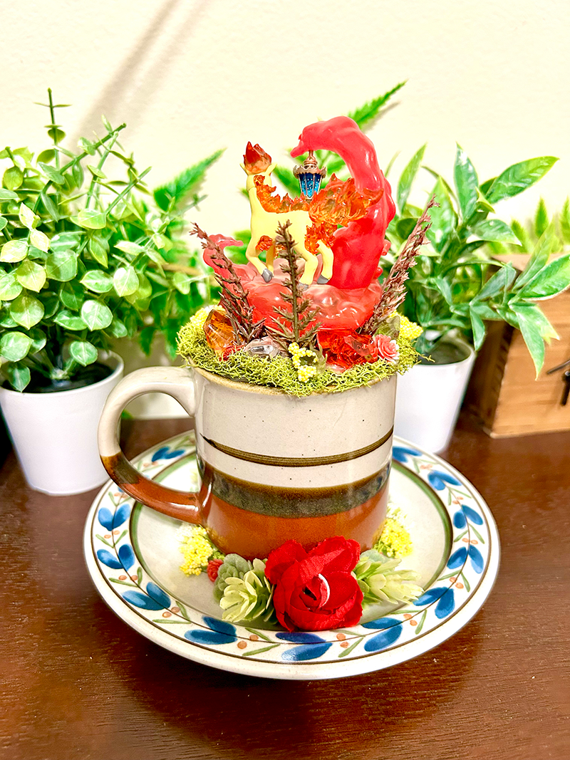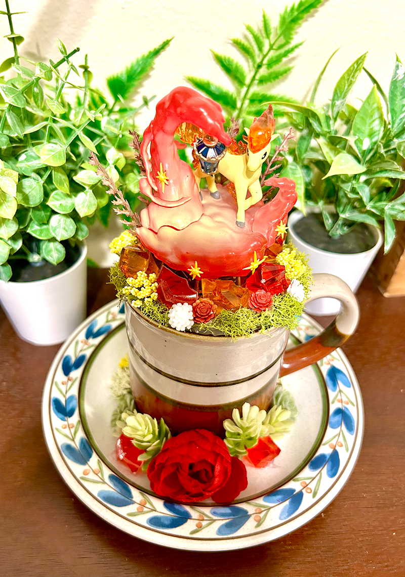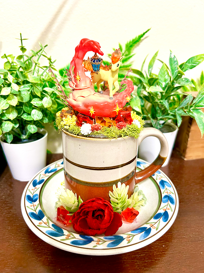 This tea cup terrarium features Ponyta from Pokemon. It is full with artificial flowers and succulents so it is zero maintenance. The tea cup and saucer are sealed together, so nothing will fall off, even if turned upside down.