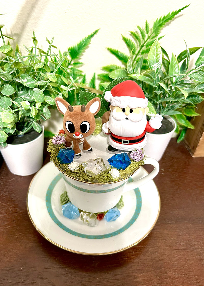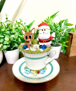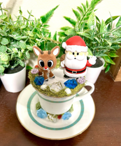 This tea cup terrarium features a flocked, fuzzy Rudolph & Santa from Rudolph the Red Nosed Reindeer. It is full with artificial flowers and succulents so it is zero maintenance. The tea cup and saucer are sealed together, so nothing will fall off, even if turned upside down.