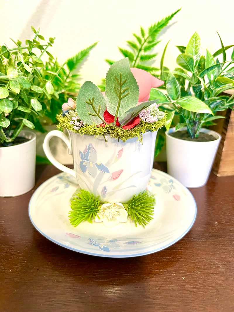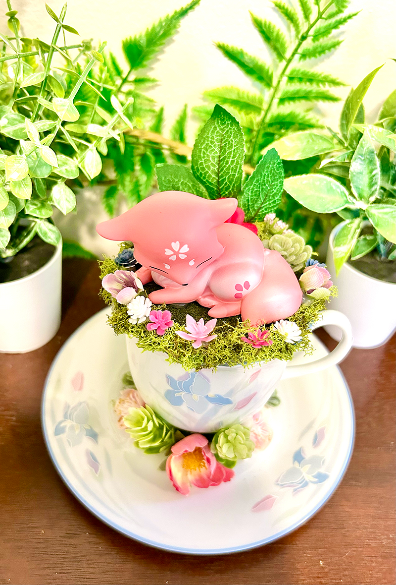 This tea cup terrarium features a Sakura Fox. It is full with artificial flowers and succulents so it is zero maintenance. The tea cup and saucer are sealed together, so nothing will fall off, even if turned upside down.