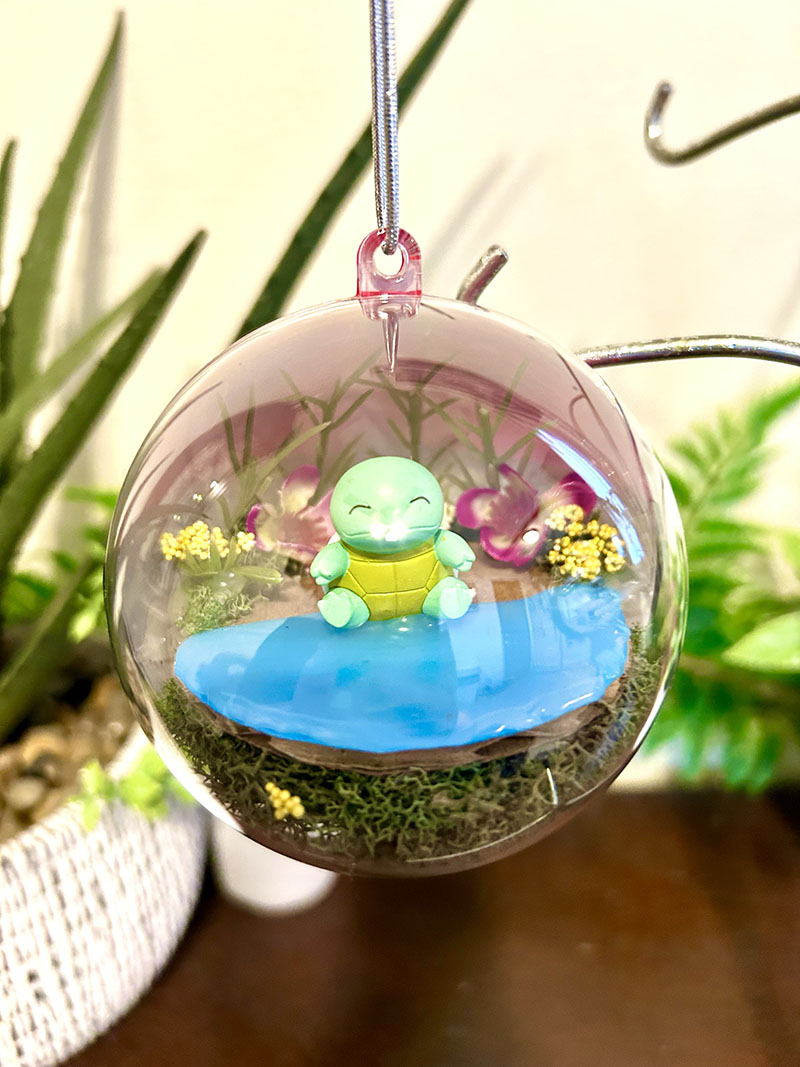 This is for a 60mm Pokeball terrarium ornament with a Squirtle in it. The Pokeball is made from a durable plastic and perfect for displays either from a Christmas tree or just display it year round. It stays sealed shut and is zero maintenance!