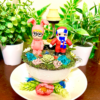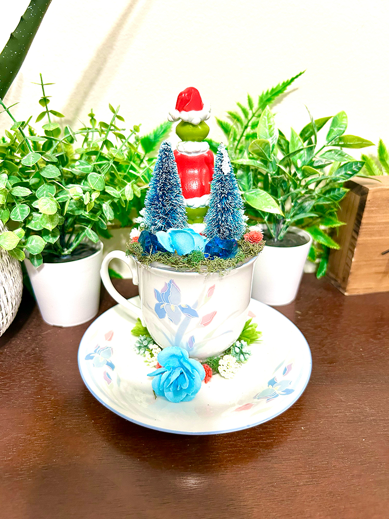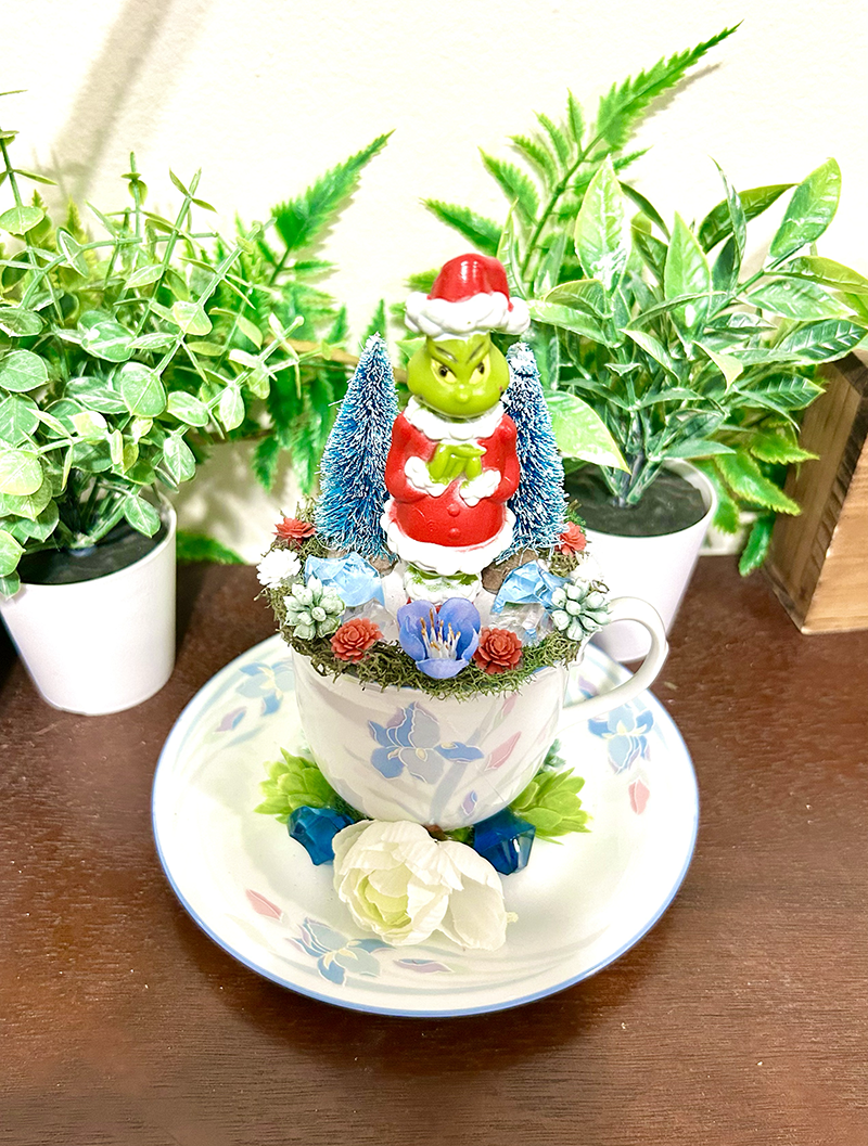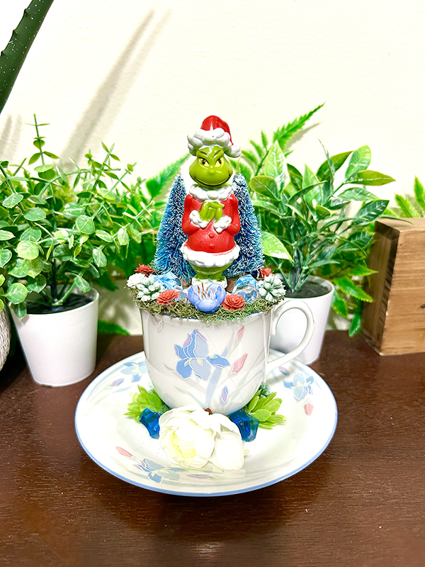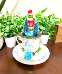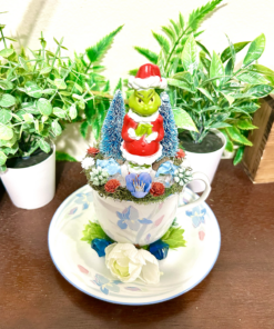 This tea cup terrarium features The Grinch. It is full with artificial flowers and succulents so it is zero maintenance. The tea cup and saucer are sealed together, so nothing will fall off, even if turned upside down.