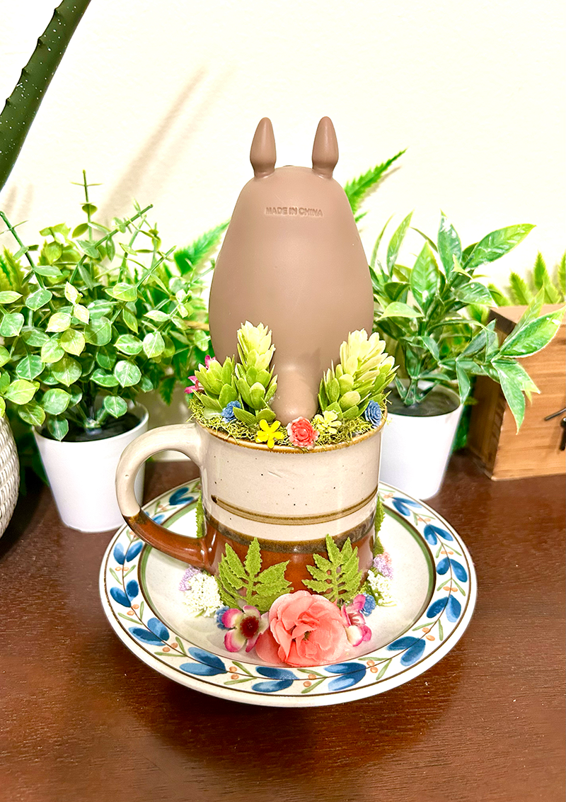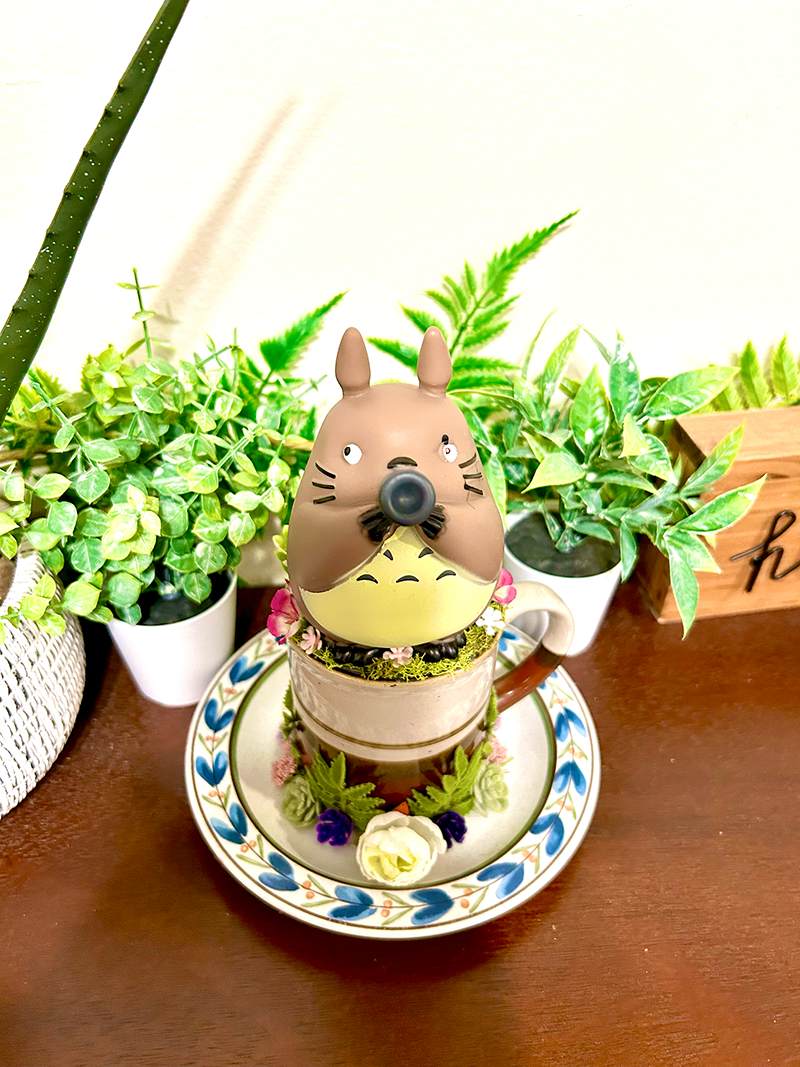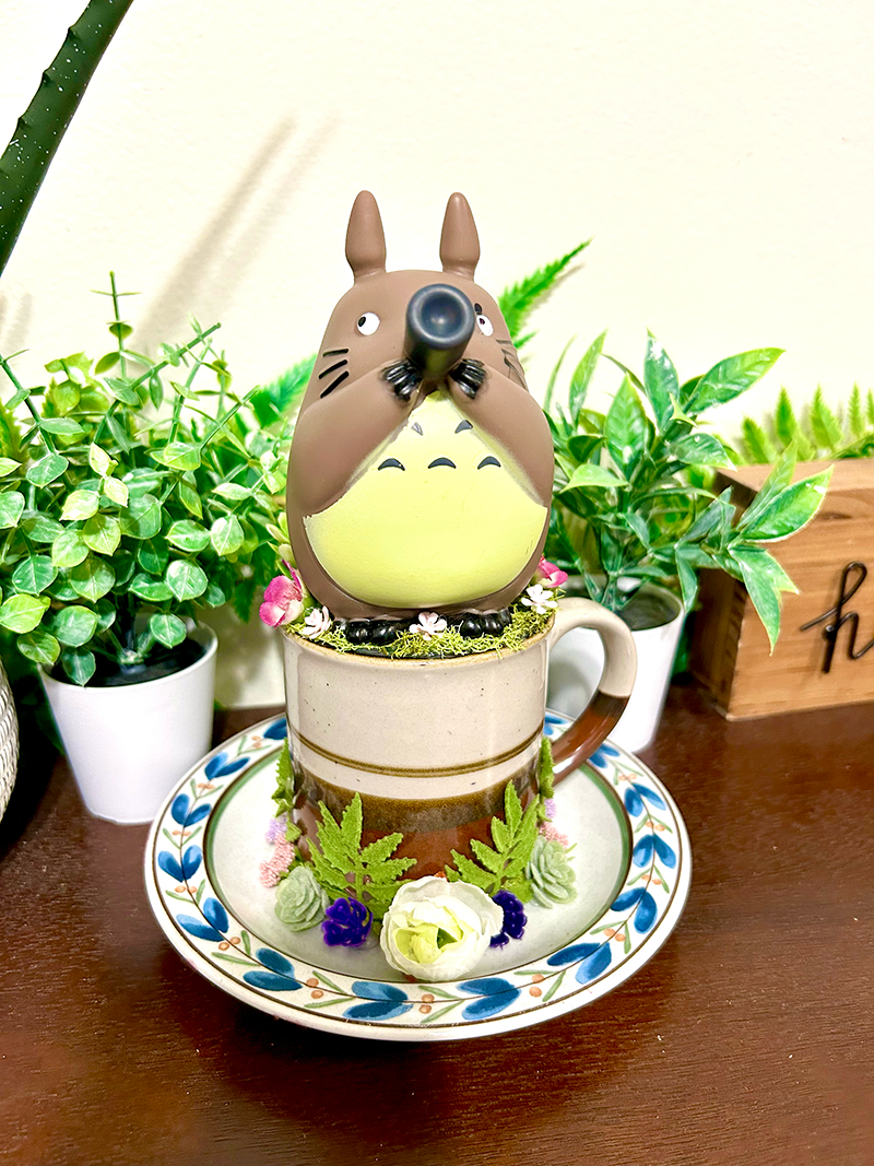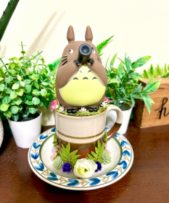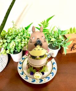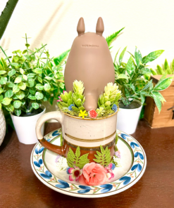 This tea cup terrarium features Totoro from My Neighbor Totoro. It is full with artificial flowers and succulents so it is zero maintenance. The tea cup and saucer are sealed together, so nothing will fall off, even if turned upside down.