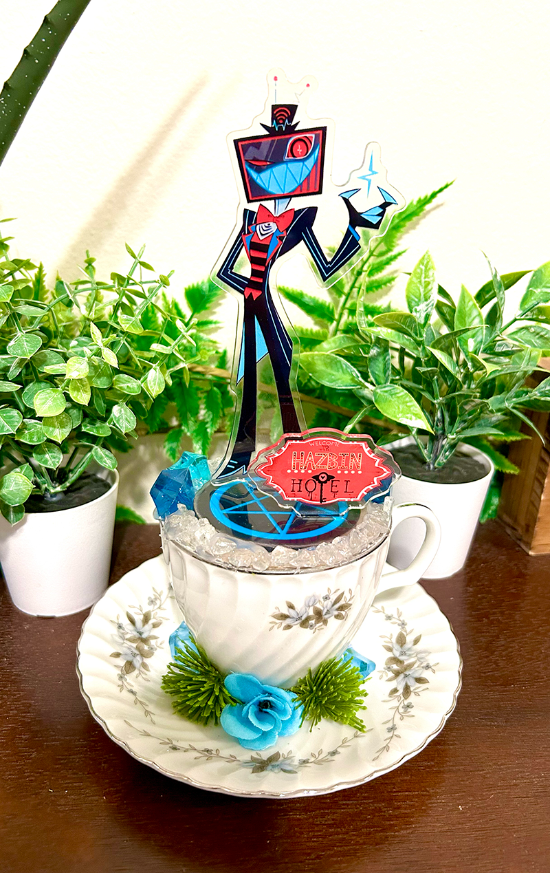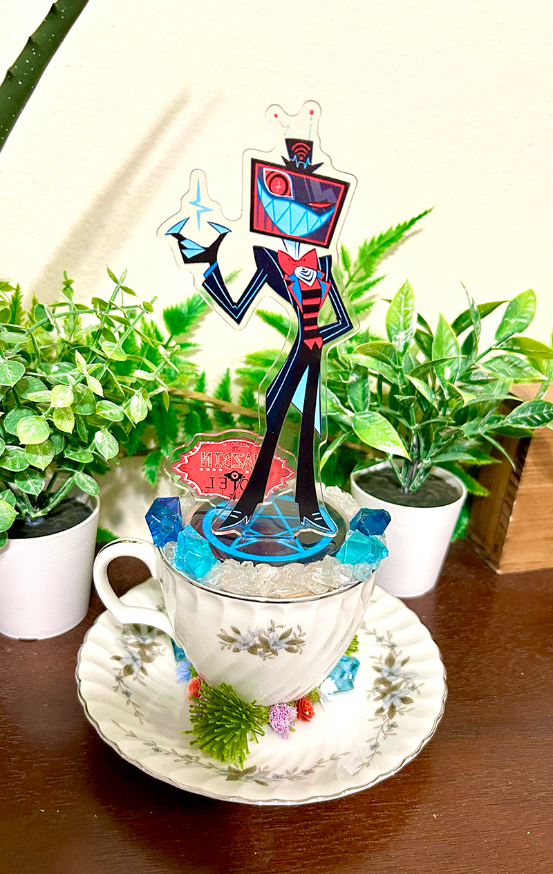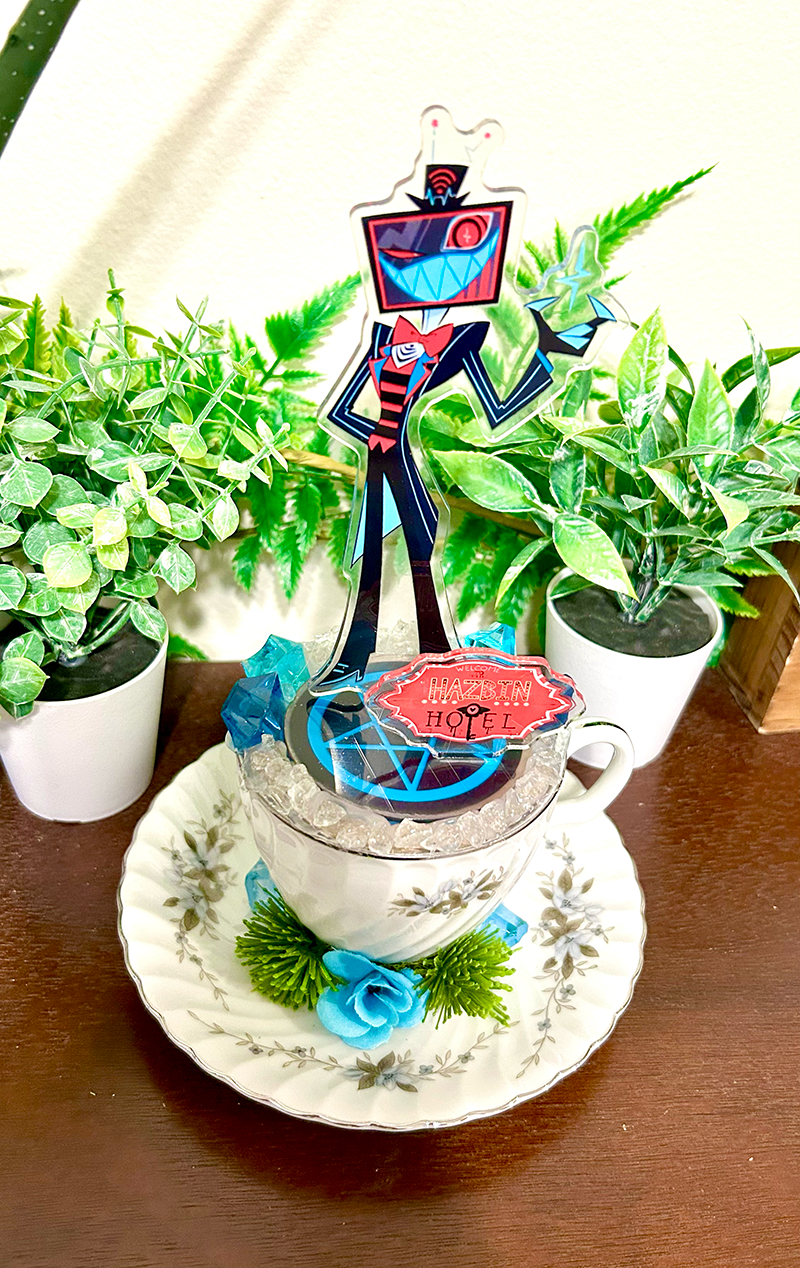 This tea cup terrarium features Vox from Hazbin Hotel. It is full with artificial flowers and succulents so it is zero maintenance.